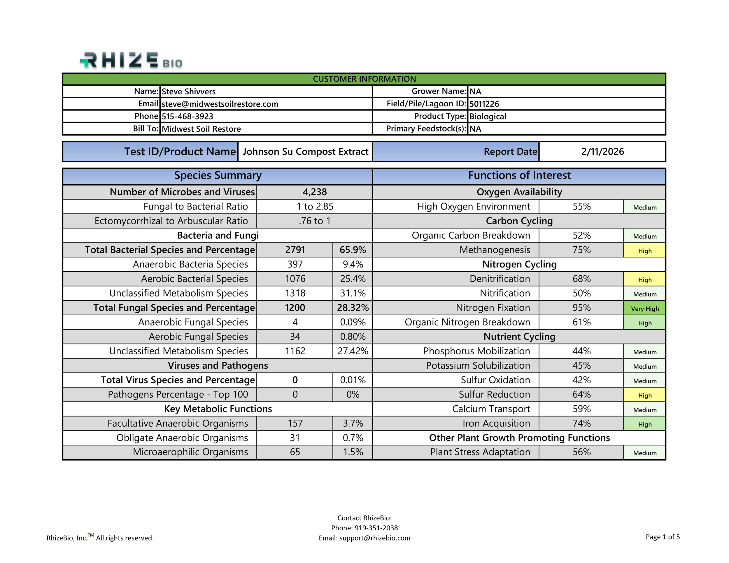 "Waters Ag Lab analyzed replicated samples of an extract of Midwest Soil Restore's Johnson-Su compost in 2026 using the Biome Makers protocol and database. These samples consistently showed the highest biodiversity I have observed across numerous compost samples and dozens of analyses of various microbial products. What's more, this extract contained solid contingents of functional groups typically low in compost samples, such as plant growth hormone synthesizers, beneficial biocontrol agents, and stress-mitigating microbes such as iron chelators and abscisic acid producers."